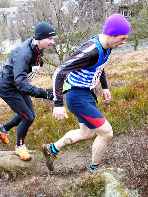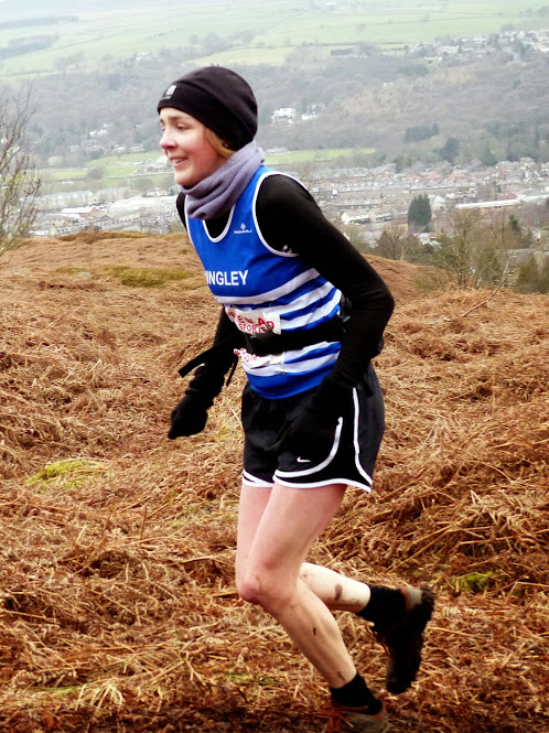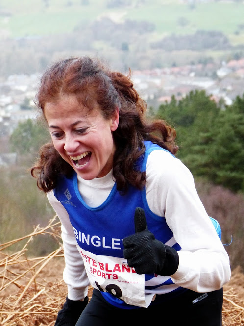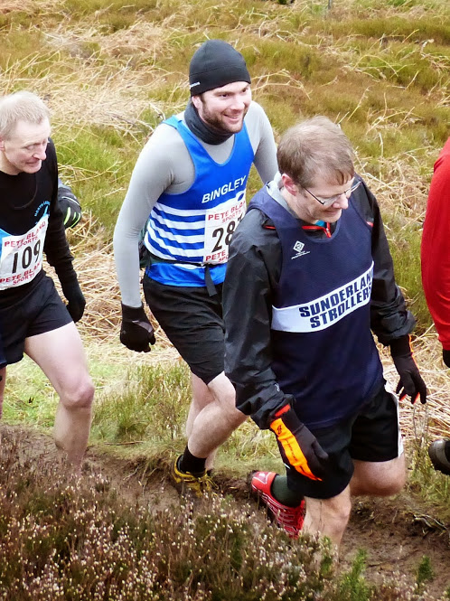 Bingley had 4 ladies and 5 men (plus Mark from Sunderalnd who works in Bingley during the week and runs with us on a Thursday) in the start line. Robbie Williams and Sunderland Mark (Robinson) were on their first fell race – and Ilkley is not an easy introduction. I knew Robbie was doing plenty of off road running but Mark was sporting bright, new off-road shoes. I was a little worried – Mark is the first to chirp up he will go back or go a different way in his road shoes if we have the odd ‘off road’ bit on a dark Thursday night club run. My worries were needless – Robbie and Mark enjoyed their runs. Both started at the back of the pack (not knowing about the start). Robbie took it steady in the first half while he got used to what was going on and then picked his speed up (and passed me!) in the second half. Mark soon realised that mud and puddle dodging was more effort than it was worth and enjoyed having good shoes and grip for the job in hand.