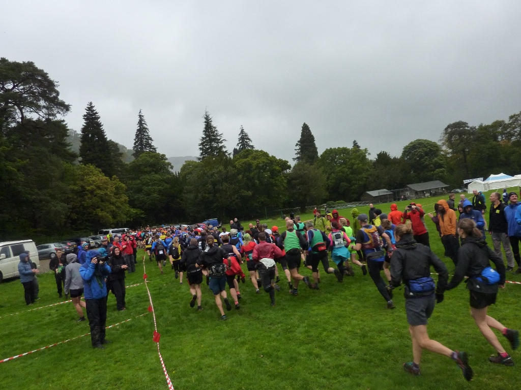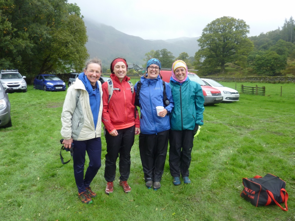 Patterdale was cloudy, windy, and wet. I drove carefully onto the sports ground keeping my fingers crossed that I would be able to get the car off. There were frequent blustery showers as I registered the team and we gathered for the start. The usual nervous excitement was heightened by the challenge of the late route changes but Denise & Vicki were in good spirits for the start. Support team Simon & Izzy gave Ellie a lift to the start of Leg 2, and I ran Kate & Sally up to Kirkstone Pass for Leg 3. Their key challenge was keeping warm while they waited for Ruth & Ellie to come in – difficult in a gale and sideways rain. Marisol & I jogged the couple of miles to the start of Leg 4 – having got the car onto some hard standing at the side of the sports field I didn’t want to risk having to park on a waterlogged field. With the difficulties of estimating times for the revised routes we had some long wait times – most people had their full waterproof kit on to try & keep warm – but not easy when you only have running gear on underneath – even with the long sleeved thermal.