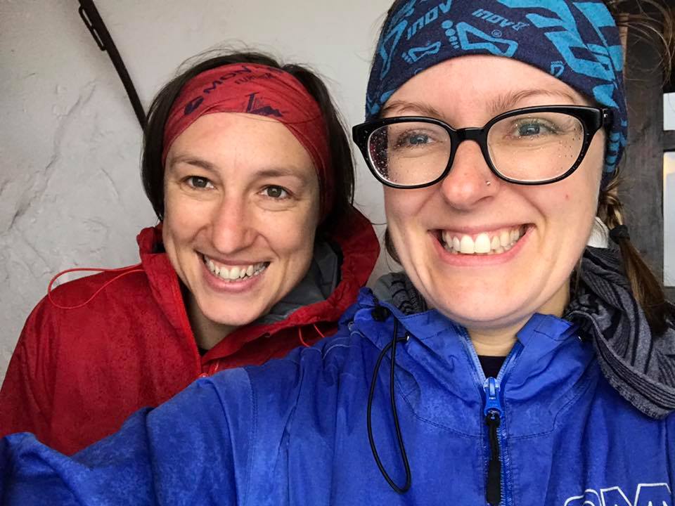 Staying covered up until we were ready to run – Becky, Kate, Sally and Marisol – with the ascent for Leg 1 disappearing into the clouds in the background.