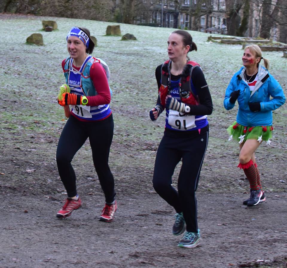 Saturday morning was frosty, still and bright. Great for a run but watch out for the ice. Bingley had 3 ladies and 4 mens teams including a Vet 60 team – 56 runners. The first leg was disrupted when a Barlick runner fell and broke his ankle. He was one of the 3 leading teams – the others being Bingley A’holes (Vic Wilkinson & Ian Holmes) and Wharfedale. The 6 were running as a group well ahead of the rest of the field and they all stopped when the accident happened to help get the Barlick guy comfortable and keep him warm with extra layers. When the Bingley Angels (Jo Buckley & Ellie Kitchen) caught up Jo (Doctor) immediately stopped to help and then stayed with him until safely in full medical care. As the broken foot was pointing in the wrong direction Jo offered to straighten the ankle on site but the guy, who was an anaesthetist, declined the offer!